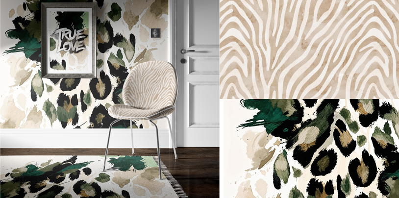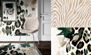 Ici, l’imprimé animal ne se contente pas d’être un simple motif : il devient un manifeste visuel. Une explosion de nuances terreuses – du kaki profond au beige soyeux – dialogue avec des touches de noir et de vert émeraude. Le jeu pictural, à la frontière du sauvage et du raffiné, s’épanouit sur le mur tel un tableau abstrait en perpétuel mouvement.