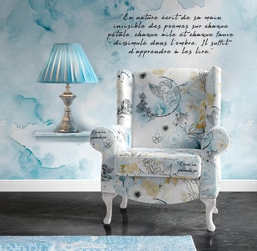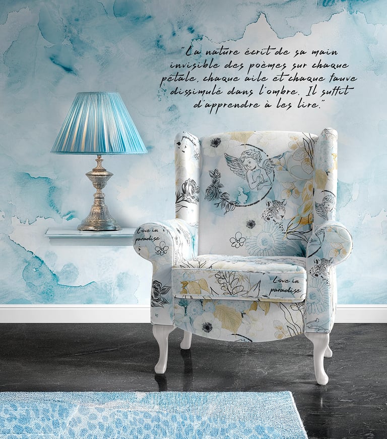 - Le contraste entre le motif aérien et la structure classique du fauteuil donne une allure à la fois intemporelle et moderne.