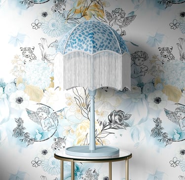 - Le bleu céleste et l’or créent une palette apaisante, parfaite pour un coin lecture ou une pause douce.