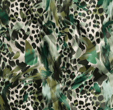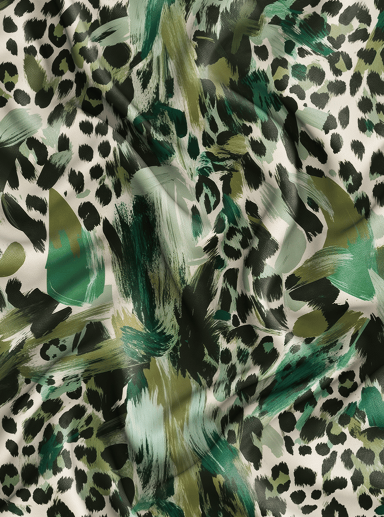Vertigo" n’est pas juste un motif, c’est une forêt en mouvement, un vent de liberté qui souffle sur ton style. Le vert émeraude et le vert sauge se mêlent comme des feuillages sous la brise, tandis que le léopard glisse discrètement, apportant force et audace. Doux et sauvage à la fois, il capte les regards et raconte une histoire pleine de vie.